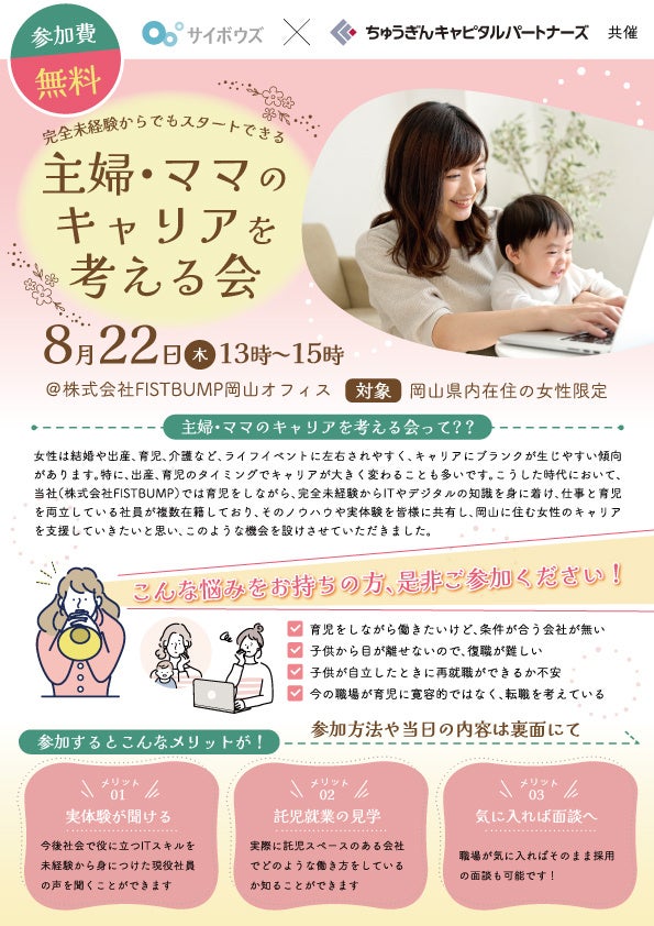 サイボウズ株式会社・ちゅうぎんキャピタルパートナーズ共催!主婦・ママのキャリアを考える会を開催いたします。