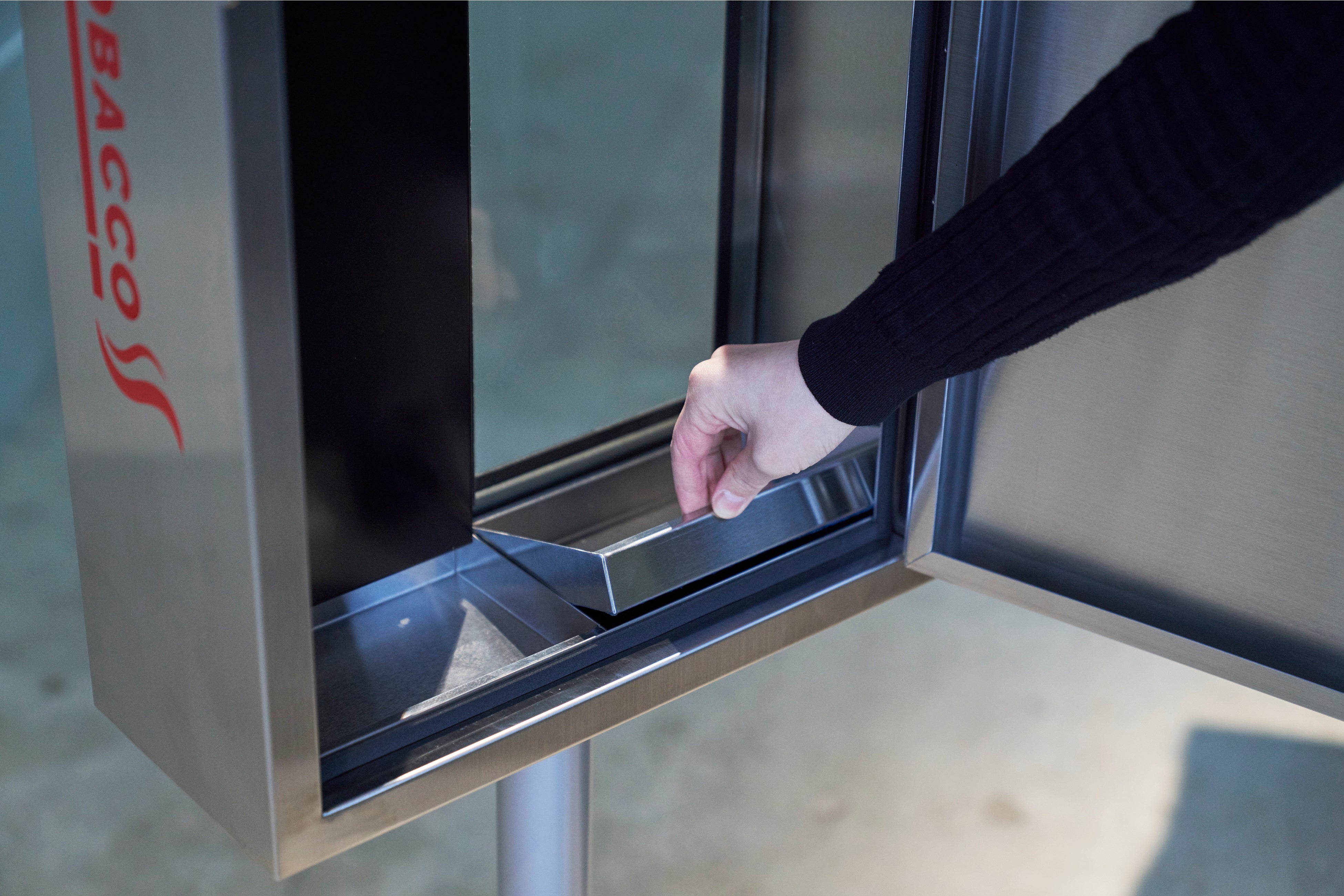 吸い殻の清掃対応を簡単にするため、受け皿の用意や背面からの取り出しなど、担当者の清掃におけるあらゆる負担を軽減した設計をしています。