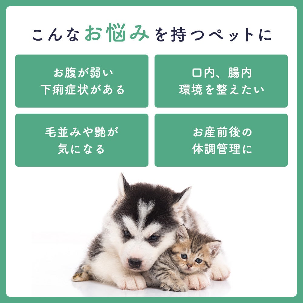 それらすべてのベースに、国産のメシマコブ茸菌糸体エキス末を配合し、幼少期からシニア期のワンちゃん・ネコちゃんたちの健康を維持し、免疫力をサポート。