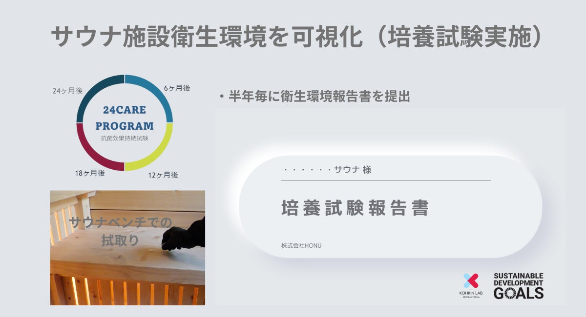 定期的な培養試験(2年間)を行い、さ活ユーザーへの安心・安全をアピール。施設の衛生環境を可視化することによりサウナ施設のブランディングを促進させます。