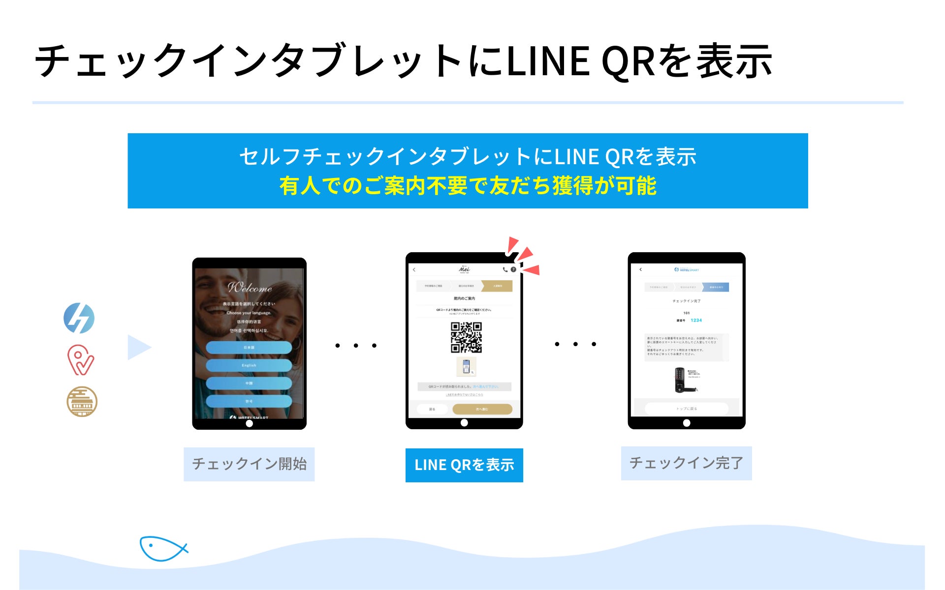 施設様はこれまで通りチェックインタブレットを置いておくだけで、LINE友だちを獲得可能です。