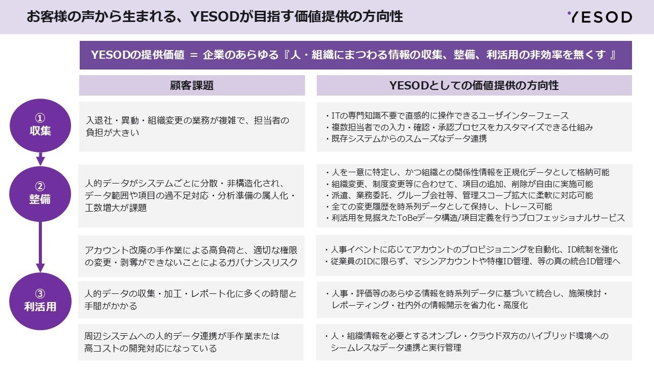 YESODは、お客様からいただいた声をもとに、「人・組織にまつわる情報の収集、整備、利活用の非効率をなくす」という価値提供の方向性を再定義しました。入退社・異動対応の複雑な業務フロー、システムをまたいだ人材データの分散管理、アカウントガバナンスリスクといった現場課題に正面から向き合い、収集・整備・利活用の各フェーズで具体的な価値を届けられるよう、ロードマップに反映してまいります。