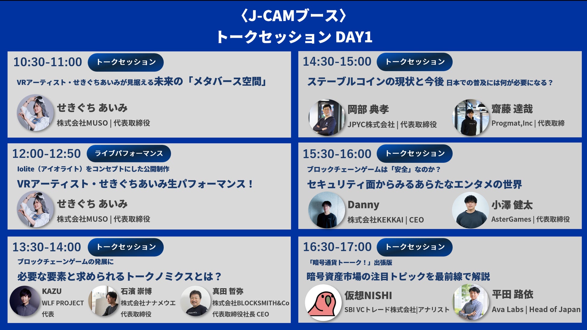 このほか、J-CAMブースで行われるセッションでは、VRアーティストとして知られる「せきぐちあいみ」氏によるパフォーマンスや、人気ゲーム「人狼ゲーム」をBCG(ブロックチェーンゲーム)化したWLF PROJECT(ウルフプロジェクト)のKazu氏、Progmatの齊藤達哉氏やJPYCの岡部典孝氏といったWeb3.0領域の有識者らが登壇予定です。