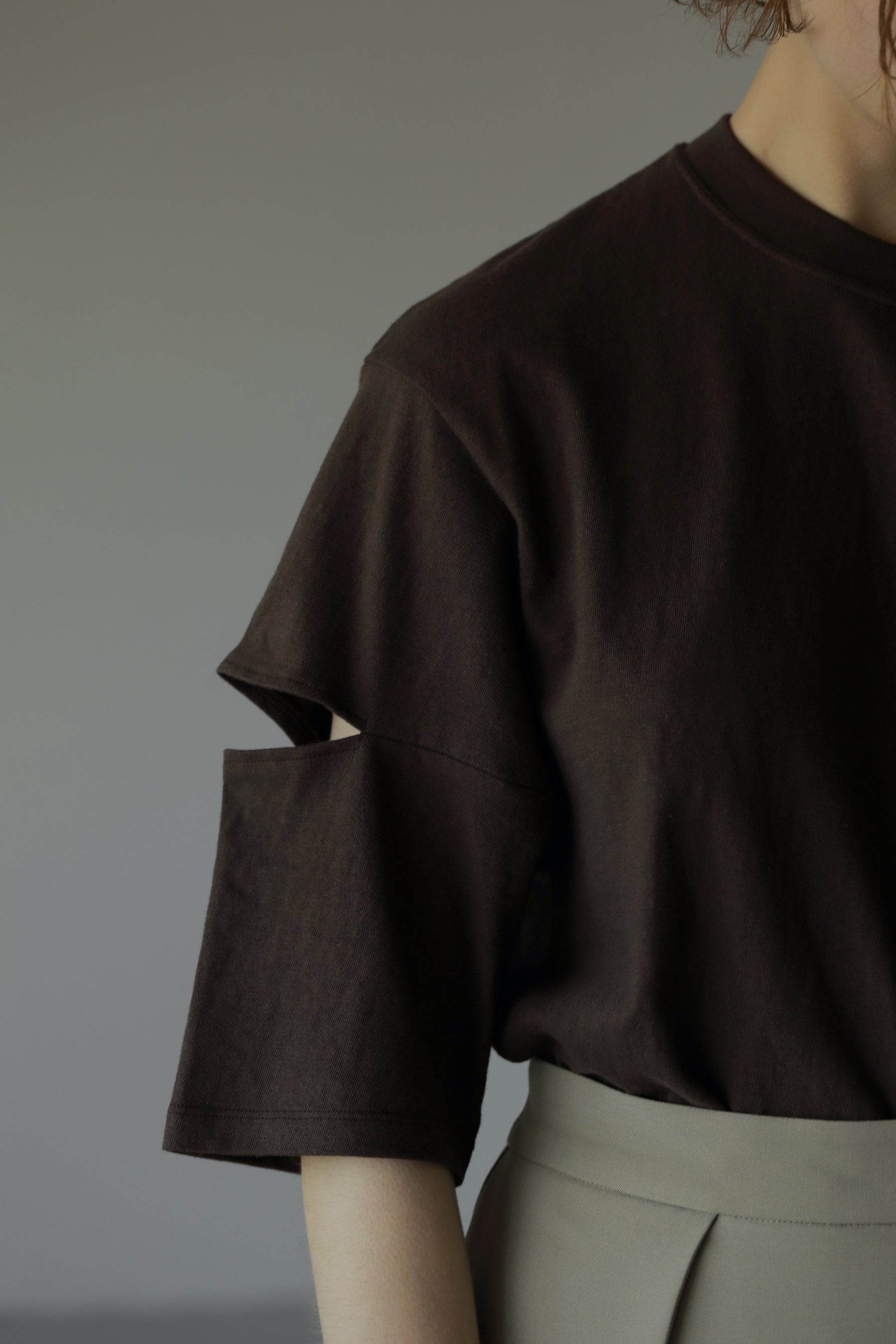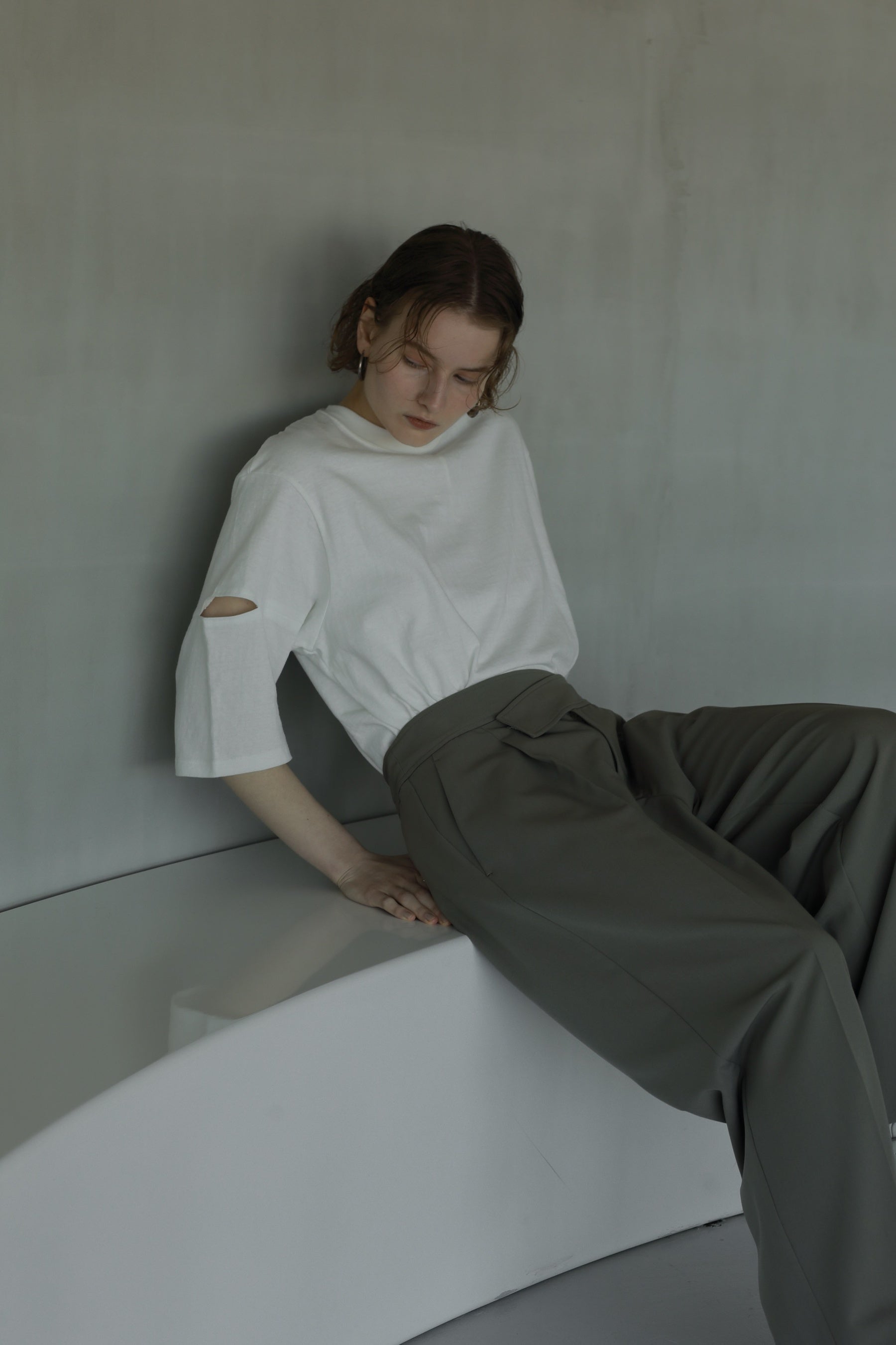 袖のスリットが女性らしさをプラスするTシャツ。Americanaオリジナル素材「ラフィー天竺」を使用。糸を製造する際に削り落とされた綿を再利用し織られたムラ感のある天竺で、ややクラシックな風合いです。とても肌触りの良いソフトな着心地で、表面感はややドライタッチなのがこの素材のポイント。程よい透け感があるので、カジュアルすぎず、落ち感のある女性らしいラインで着用していただけます。