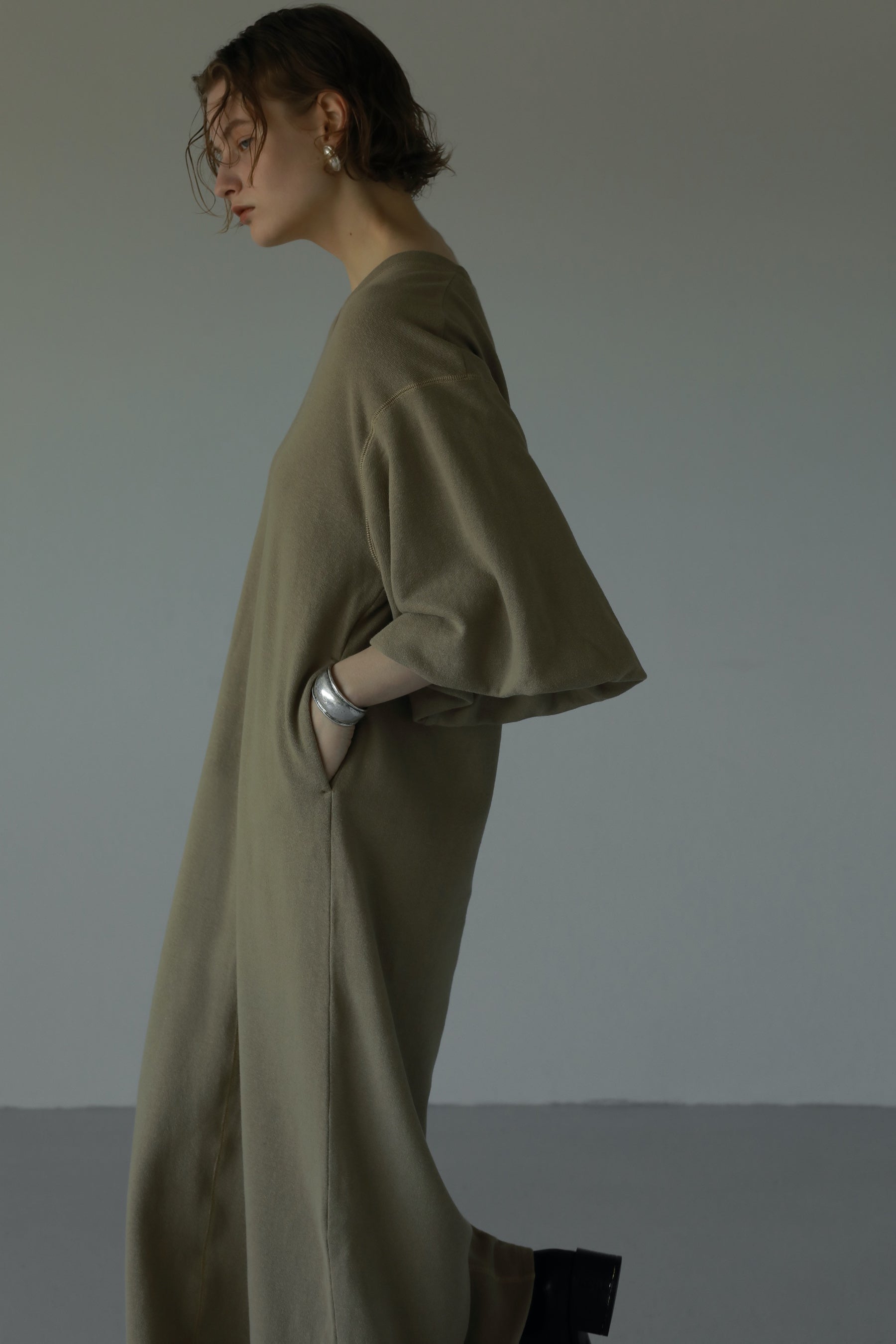 MANOFで人気の高いボリュームバルーンスリーブの裏毛ワンピース。Americanaオリジナル素材「ラフィー裏毛」を使用。細番手のラフィー糸をローゲージで甘く編み、ふわっと軽いタッチになっています。裏毛なのに落ち感があり風合いも女性らしいカジュアルすぎないデザイン。スリーブは程よいボリューム感とちょうど腕が細く見える丈感がMANOFらしいバランスになっています。胸元は深めのVネックデザイン。後ろに抜いた時にできる背中のドレープ感も程よく、ルーズで女性らしい印象になります。