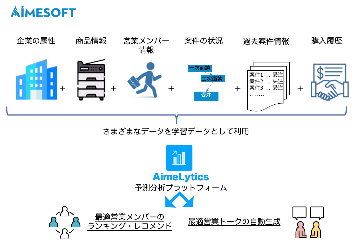 今回アイメソフトが開発したAI営業支援システムでは、アイメソフトの予測分析プラットフォーム「AimeLytics(アイメリティクス)」を軸とした2つの主な機能が含まれます。