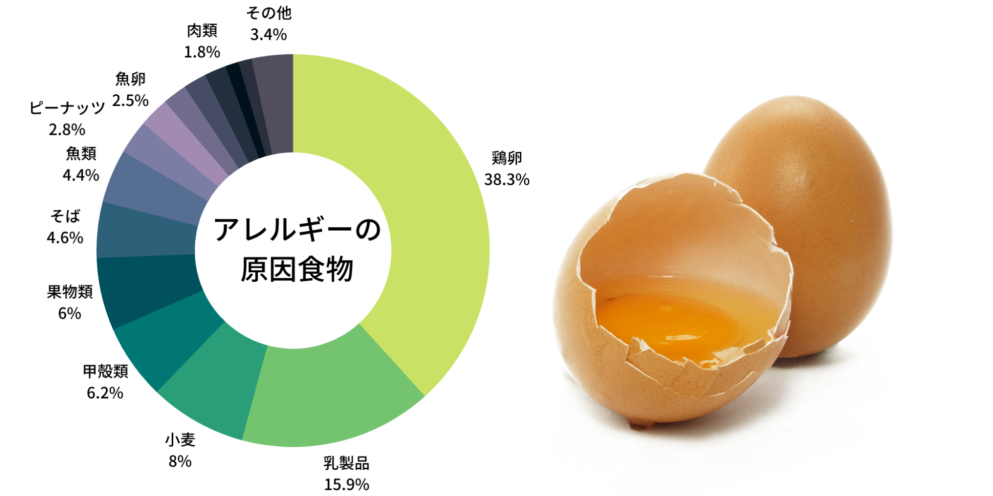 現在日本では、全人口の1~2%が食物アレルギーを抱え、うち鶏卵が38%の原因と占めるといわれています。