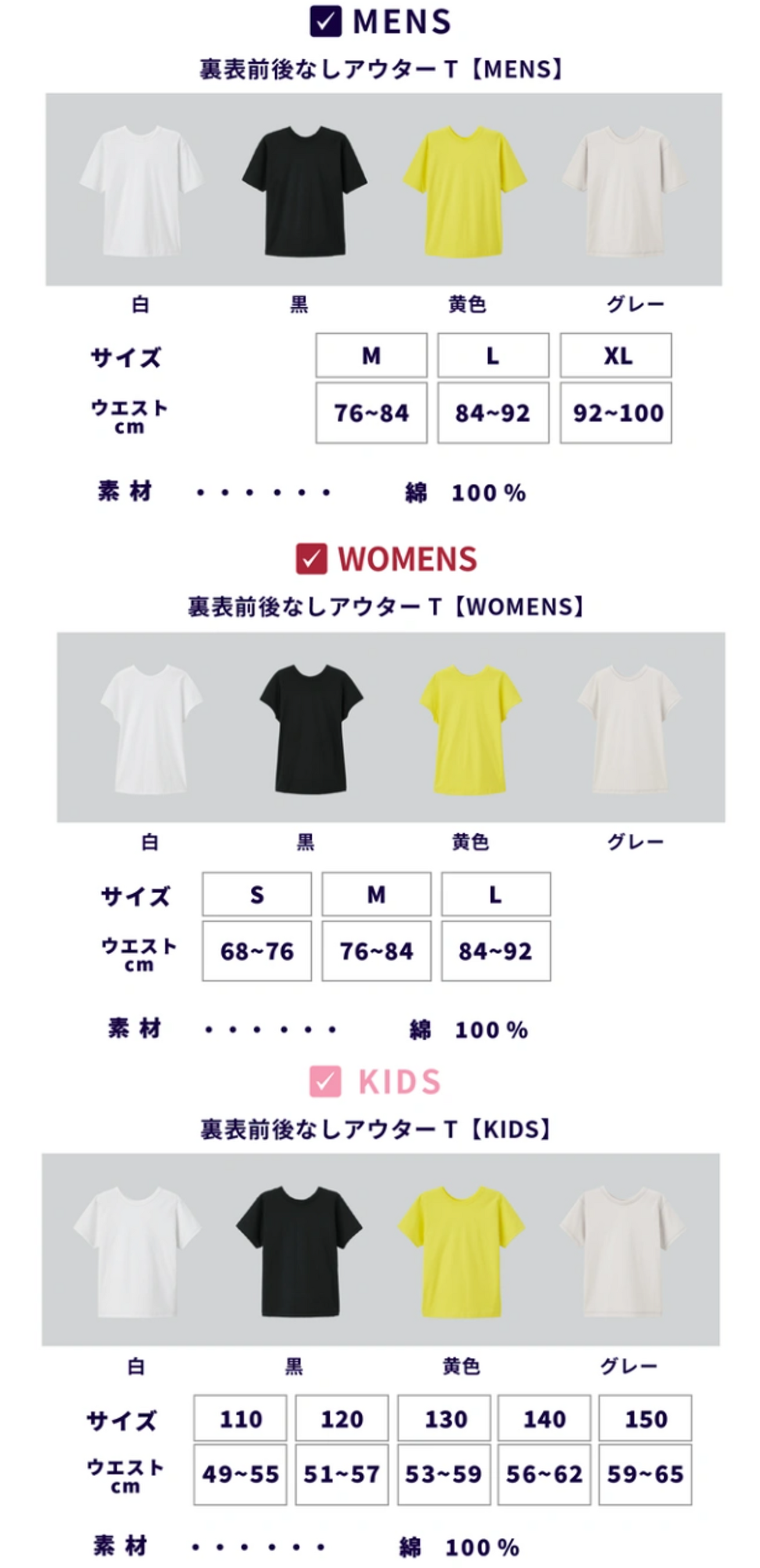裏表のない肌着(Tシャツ)からスタートし、その後、裏表だけでなく前後もない肌着、裏表とかかとのない靴下、裏表前後のないパンツを開発して提供しております。