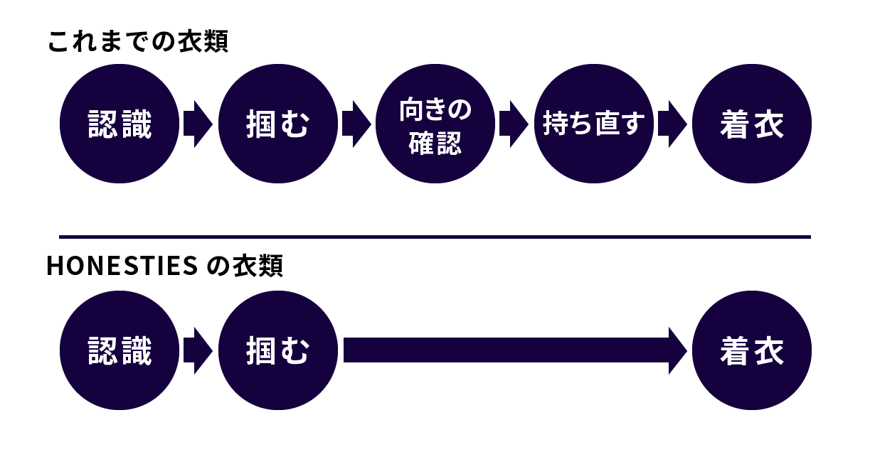 HONESTIES SKYは裏表前後をなくすこと「考えずに脱ぐ!着る!たたむ!」ができ、時短やイライラを解消できる画期的な機能性肌着です。特に忙しい子育て世代のママパパや、ハンディキャップのある方の負担を解消する製品です。