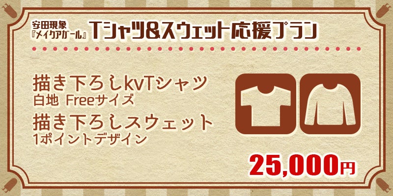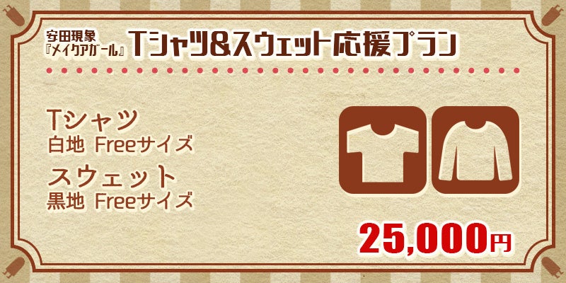 →『メイクアガール』描き下ろしイラストTシャツ(白地、Freeサイズ、サイズ指定不可)およびワンポイントデザインスウェット(黒地、Freeサイズ、サイズ指定不可)をセットでご送付。
