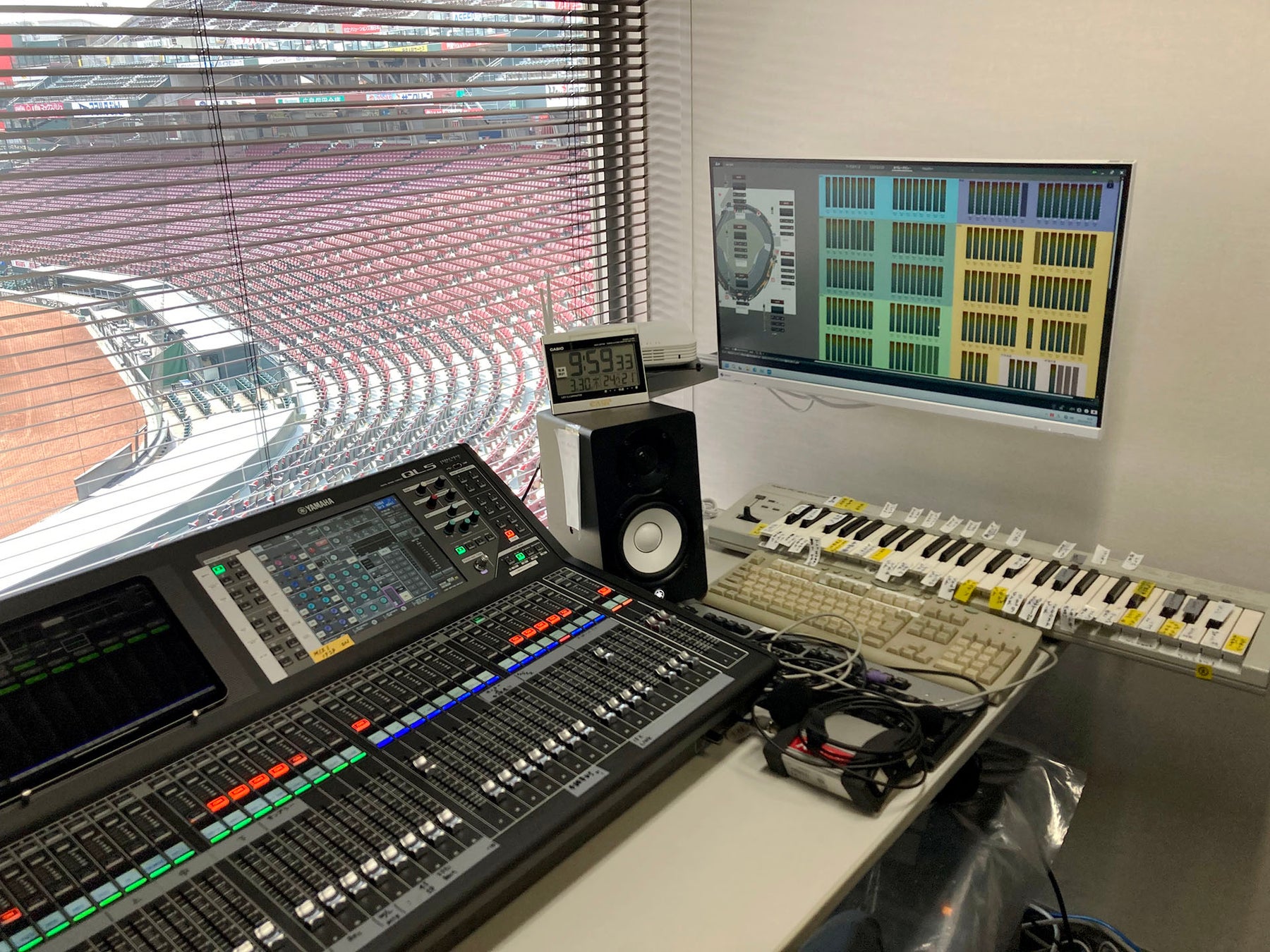主にウグイス嬢のアナウンスを行う1階放送室の調整卓と、入場曲やBGMなどの主要な音量調整を行う4階操作室の調整卓は、MIDI(電子楽器同士を接続するための世界共通規格)で連携することで、イベントに合わせた柔軟な操作性を実現しています。