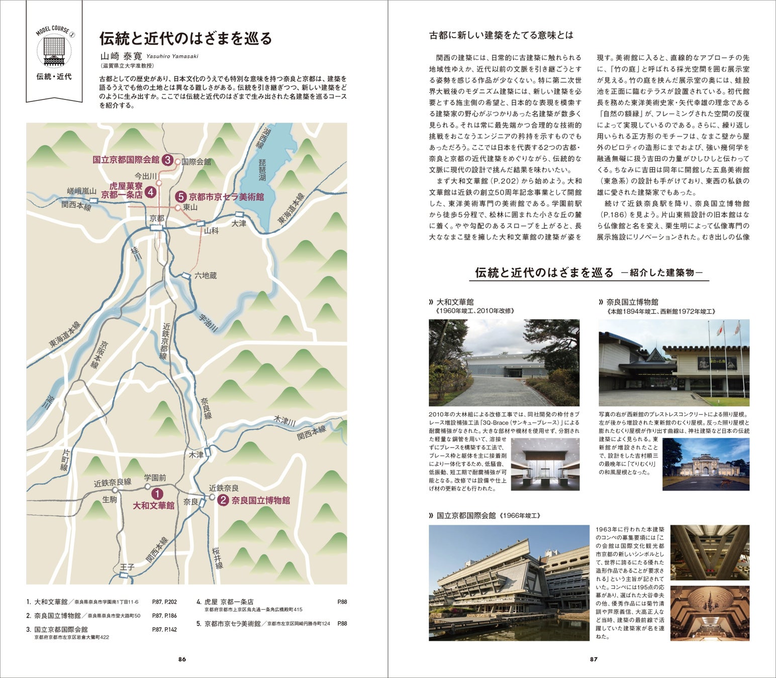 本書は読み応えのある特集記事を多数収録しています。巻頭特集「関西の建築文化から見えてくる世界」では、116の建築作品をまとめる中で見えてきた関西建築の特徴や、関西を地盤に活躍した建築家たちを紹介。「社寺建築を見るための基礎知識」では、小屋組や組物など社寺建築の構造に関わる技術や形式について基礎から解説しています。コラムでは、「タワー・関西風建築」「伝統と近代のはざま」「村野藤吾」など関西建築のキーワード5つをテーマにモデルコースを作成。建築単体の魅力に加えて、歴史や文化、作家を感じられる旅になるはずです。