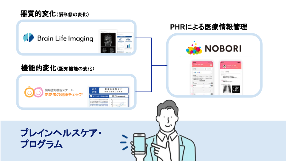 脳ドックにおけるAIによる脳体積測定サービスでトップシェアを誇るSplinkが提供する脳ドック用AIプログラム「Brain Life Imaging®」、国内の脳ドックで広く採用されており認知機能検査では200万件以上の検査実績を持つ、国内最古参のミレニアが提供する簡易認知機能スケール「あたまの健康チェック®」、また医用クラウドPACS分野のトップシェアであり、PACS提供企業として唯一のPHR(パーソナルヘルスレコード)を提供するPSPによる医療情報管理アプリ「NOBORI」を活用することで、患者様自身が蓄積された記録を適宜スマートフォンで見直すことができるようになります。加齢や生活習慣と共に知らず知らずのうちに変化していく脳の健康を器質面・機能面の双方から可視化し、予防促進・生活習慣の改善へとシームレスな体験へとつなげていくことが可能となります。