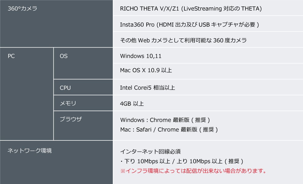 配信側の360度カメラは、Webカメラとして利用可能な360度カメラで使用可能です。