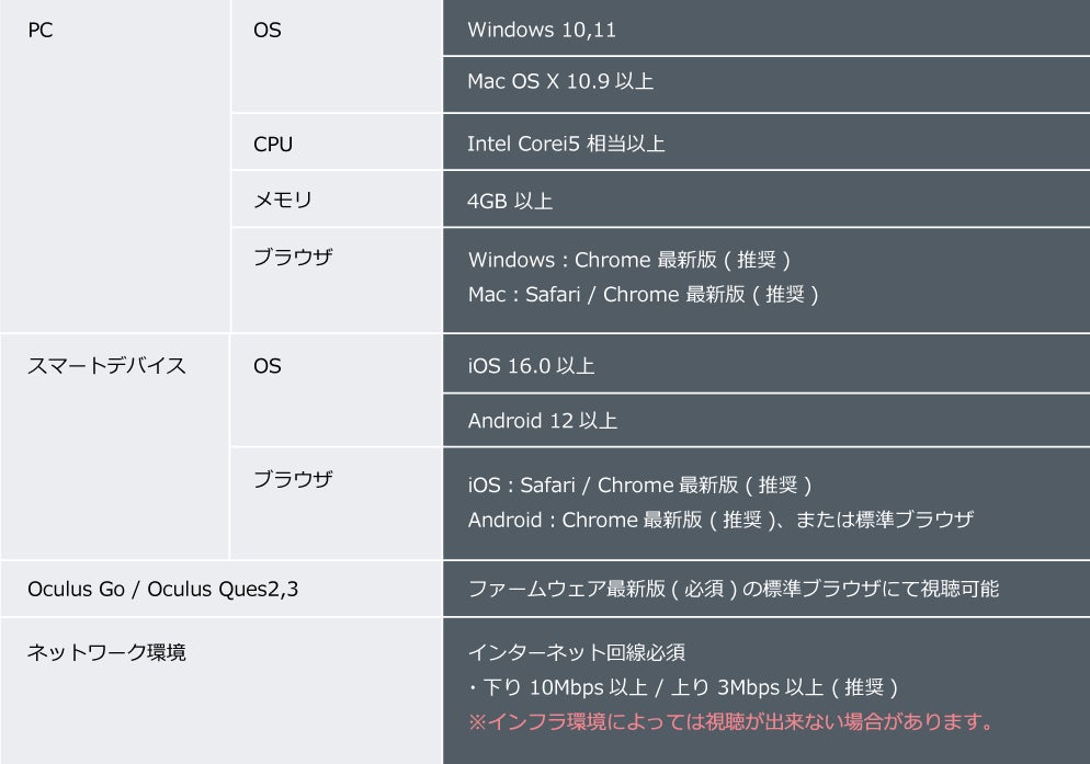 使用できるVR機材はOculus GoやMeta Quest2,3などが使用できます。視聴の際は専用のアプリなどは必要なく、ブラウザ越しに視聴可能なため導入もスムーズにできます。