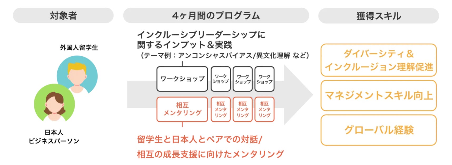 日本の大学で学ぶ留学生と日本人ビジネスパーソンがメンタリングを通じて、相互理解と異文化間コミュニケーションを、約4か月間実践的に学ぶアクションラーニング形式のプログラムです。