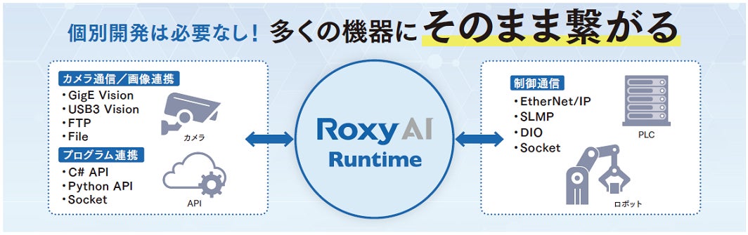 また、「Roxy AI」ランタイムライセンスにより、ノーコードで主要なカメラやPLCなどとの機器連携が可能となり、短期間・低コストで検査システムを導入できます。