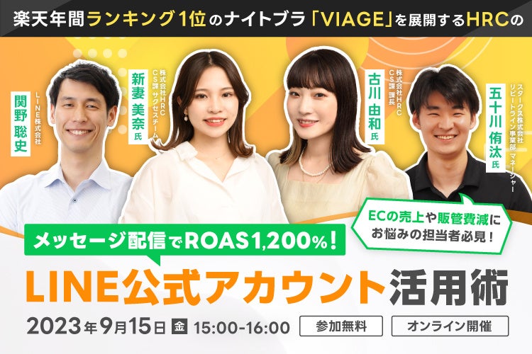 本セミナーは、LINE公式アカウントや弊社が開発・提供するAPIツール「リピートライン」を導入いただいているナイトブラ「VIAGE」を展開する株式会社HRC様に、カート情報のデータを活用することでROAS1,200%という成果を出したLINE公式アカウントのメッセージ配信の施策内容や、大幅な問い合わせコストの削減に成功した、LINE上でのbotのシナリオと問い合わせを自動応対するまでのステップなど、具体的なLINE公式アカウントの活用方法についてお話しいただきます。