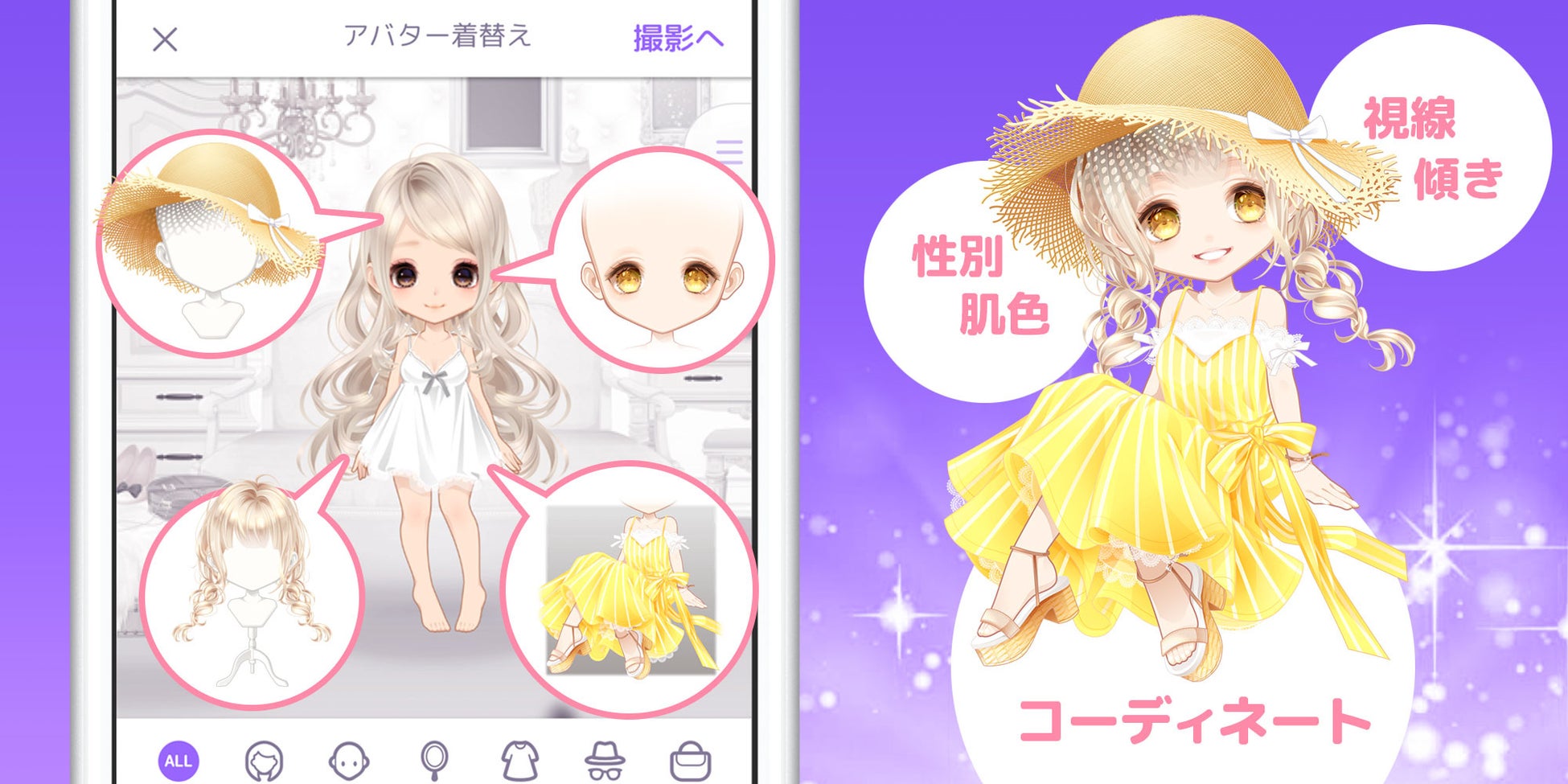 服や髪型などを組み合わせる一般的なきせかえ機能に加え、性別や肌色、目線と頭の傾きを変更して、あなたの好みにクリエイトすることができます。