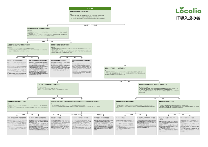 株式会社ロカリア(本社:福岡県福岡市、代表取締役:深澤大我)は、地方中小企業を中心としたAI導入相談やAIコンサルティングサービスでのノウハウを「IT導入虎の巻」としてフローチャートに落とし込んだものを公開いたしました。