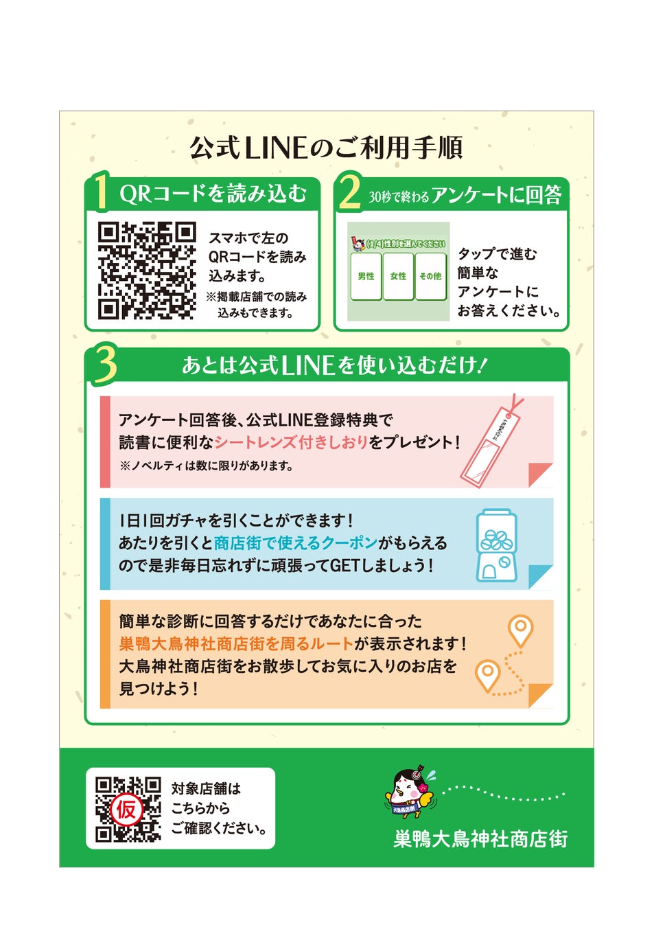 SNSや商店街内店舗設置のQRから、巣鴨大鳥神社商店街の公式LINE登録が可能です。