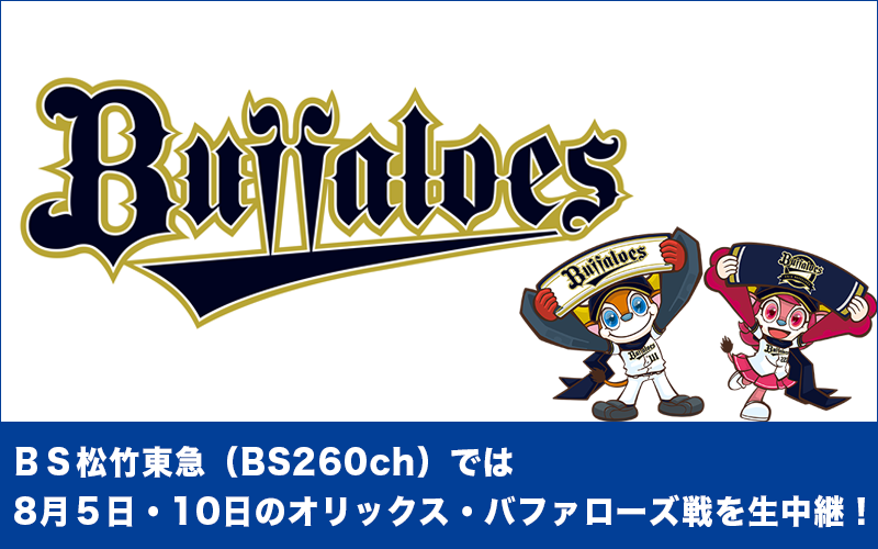BS松竹東急株式会社(本社:東京都中央区築地、代表取締役:橋本 元)は、8月5日、10日に行われるオリックス・バファローズ主催のホームゲームを「BS松竹東急ナイター」として生中継することを決定いたしました。