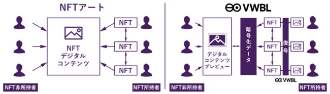 従来、NFTは所有者以外もメタデータに紐づいたコンテンツを閲覧することが可能でしたが、VWBLは分散型鍵管理技術により、分散型アクセスコントロールを行うことで、NFTの所有者のみが暗号化されたコンテンツを復号し閲覧できる機能を実装しています。これによってコンテンツ事業者がweb3上でCDやDVDなどのメディアと同じようにNFTをメディアとして利用したデジタルコンテンツ流通を実現することが可能になります。