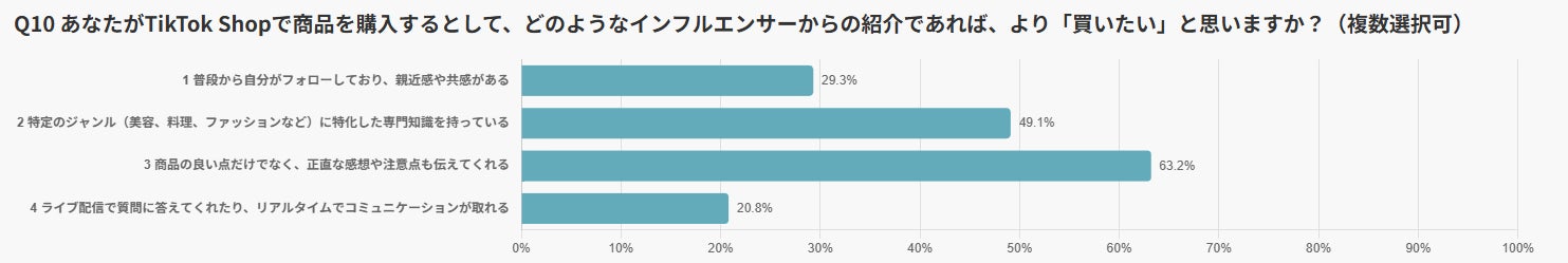 さらに、「ライブ配信で質問に答えてくれたり、リアルタイムでコミュニケーションが取れる」(22人/20.8%)も一定の票を集めており、リアルタイムでの双方向コミュニケーションが信頼につながる要素であることが示されました。