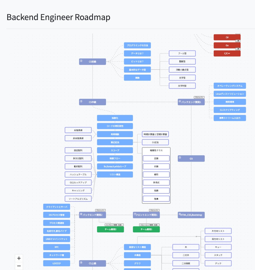 私たちが開発したバックエンドエンジニアのロードマップは、未経験者がこの分野に入るための明確なパスを提供します。このロードマップは、学習者が必要とするバックエンド開発に必要な基礎知識と実践的スキルを段階的に習得できるように設計されています。