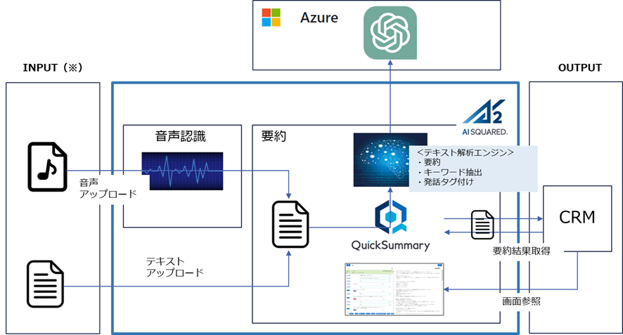 「QuickSummary2.0」の入力データは、コールセンターにおける対話のテキストとなります。入力データに対して①オペレーター向け画面参照、②APIによる要約結果の取得、の2パターンで要約機能を利用することができます。また、当社が提供するクラウド音声認識サービス「AI2 ASR」と連携し、音声ファイルのテキスト化からご提供も可能です。