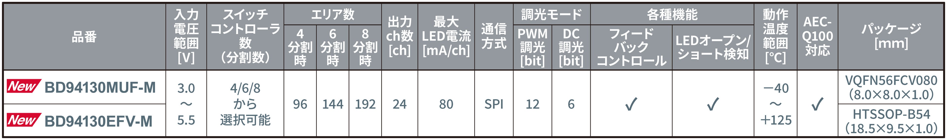 「BD94130xxx-M」は、最大8分割可能なスイッチコントローラと24chのカレントドライバを組み合わせたマトリクス方式のLEDドライバです。スイッチコントローラの系統数は、レジスタの設定により3パターン(4、6、8分割)から選択できるため、エリア数やLED消費電流に応じて、さまざまな仕様に対応できます。また、LEDの温度特性に依存せず、フィードバック電圧を一定に保つフィードバックコントロール機能を内蔵しているため、熱設計工数の削減と損失割合の低減に貢献します。