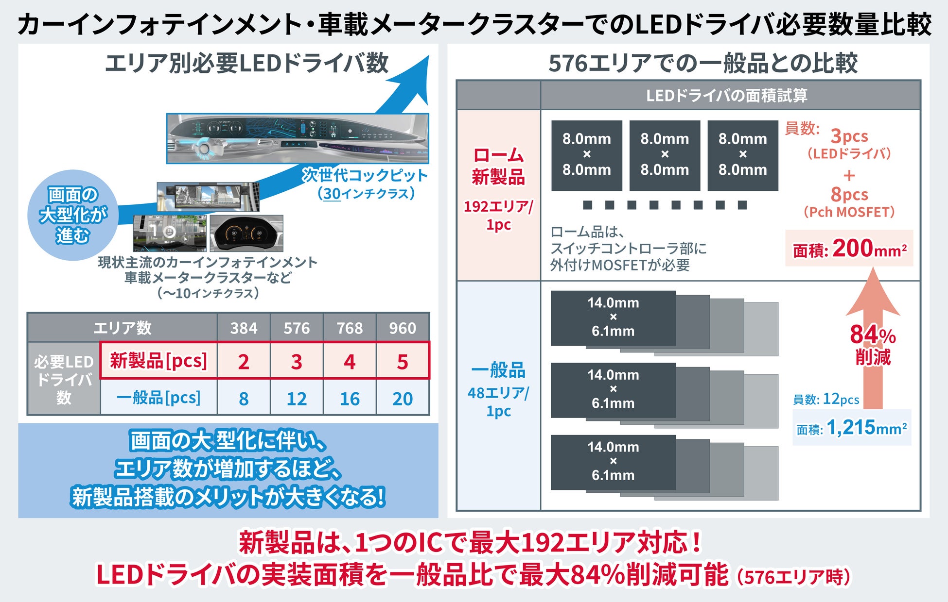 「BD94130xxx-M」は、8系統のスイッチコントローラと24chのカレントドライバを組み合わせたマトリクス方式(*1)のLEDドライバであり、バックライト用のミニLEDを1つのICで最大192エリアに分割して制御(調光)可能です。また、各エリアのミニLEDは、ローカルディミング機能(*2)により独立制御が可能なため、ディスプレイの高精細化と低消費電力化に貢献します。現在、車載ディスプレイにおいては、市場トレンドとしてエリア数の増加が進んでいますが、新製品はダイレクト方式(*3)の一般品と比べて、1つのICで制御できるエリア数が多いため、LEDドライバの実装面積と搭載数量を大幅に削減することが可能です。例えば、現在主流の10インチクラスの車載ディスプレイを搭載したカーインフォテインメントでは、約600エリアの制御が必要となりますが、新製品は、ダイレクト方式の一般品(48エリア対応品)と比較して、1/4のLEDドライバ数量で制御でき、LEDドライバの占める実装面積も最大約84%削減可能です。加えて、次世代コックピットになり画面の大型化が進むと、エリア数は増加するため、新製品の搭載メリットはますます大きくなります。