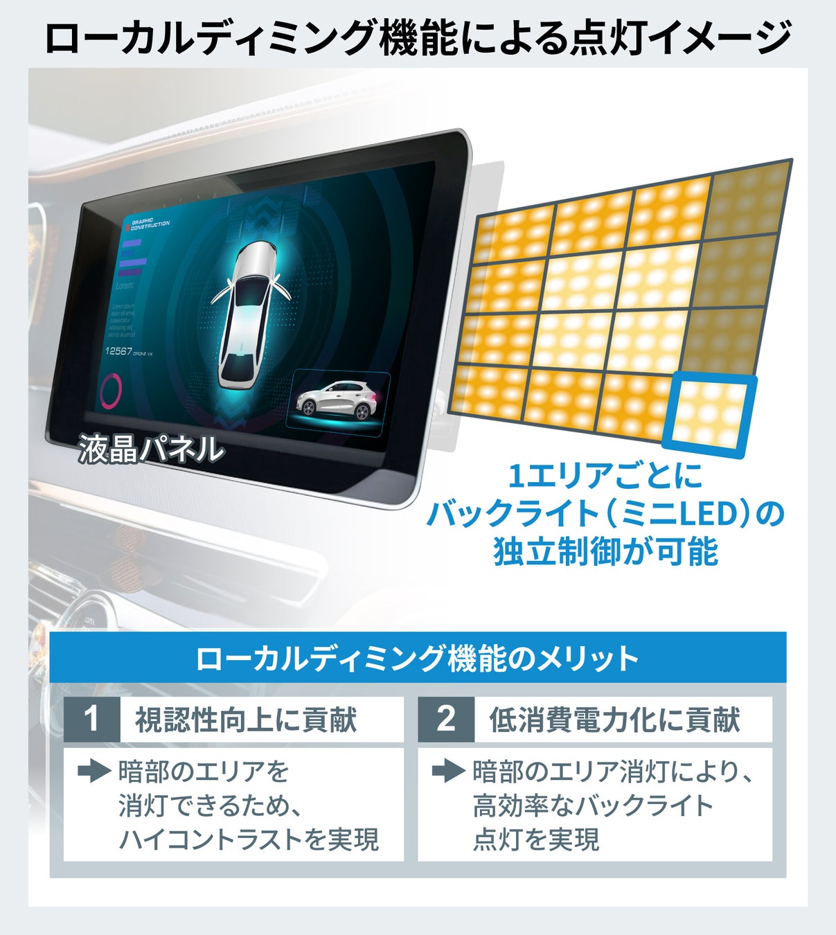 新製品は、ローカルディミング機能を搭載しているため、ハイコントラストな車載ディスプレイを実現可能です。
