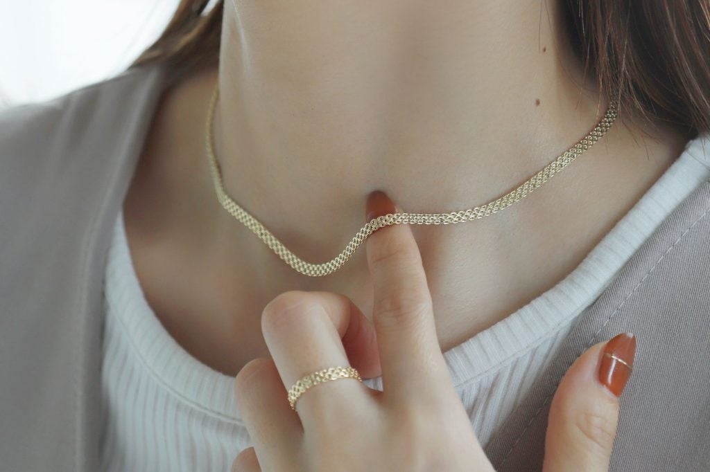 繊細な線を編み込んだかのようなそれぞれの個性が輝くデザインチェーンは、肌の上で上質に輝き凛とした印象を与えます。