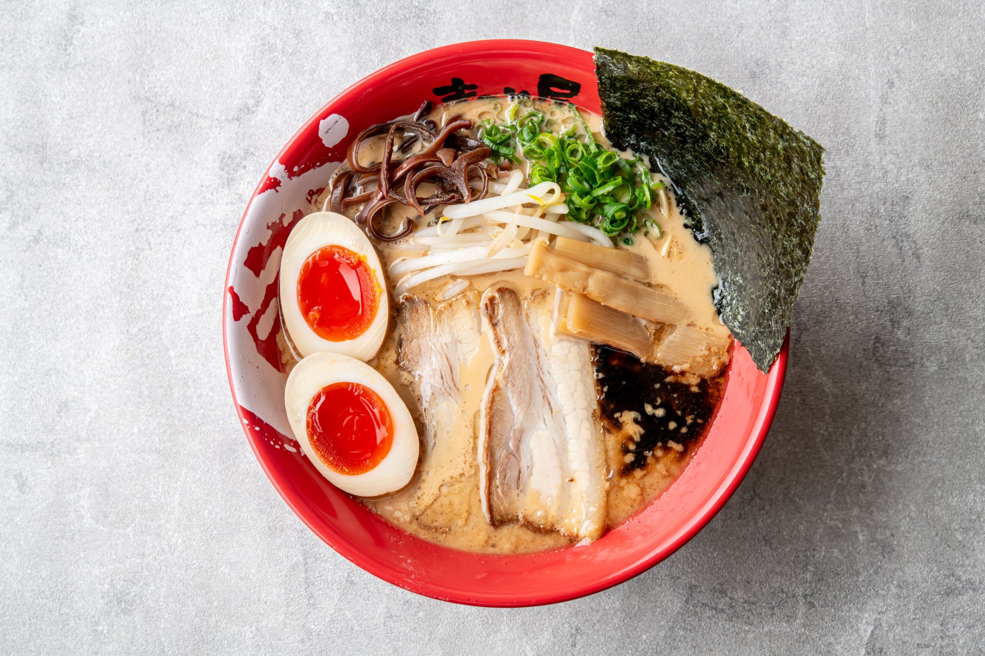 また、『厚木山際店』のオープンに合わせて開発し、その後、改良し続けてきた、濃厚牛骨白湯スープに魚介の香りと熟成醤油の味わいを加えた関東エリア限定の『濃厚魚介牛白湯ラーメン』も取り扱っておりますので、こちらも是非ご賞味ください(参考に掲載した以下の写真は『煮玉子濃厚魚介牛白湯ラーメン』になります)。