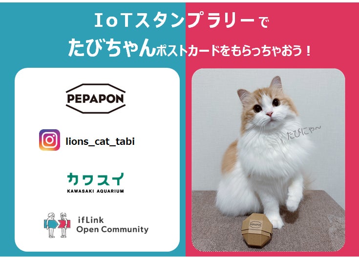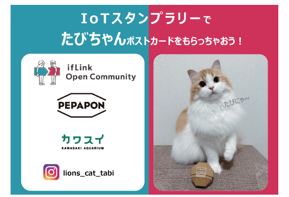 本イベントでは、カワスイにてスタンプを集めるスタンプラリーを開催します。本スタンプラリーでは、ifLinkのアプリを使ったIoTスタンプ台紙を入手した後、スタンプとなるQRコードを読み込みます。館内を散策して、必要な数のスタンプを集めた方には、lions_cat_tabiの“たびちゃん”のポストカードを提供します。また、カワスイは環境問題について様々な取り組みを⾏っていて、本イベントにおいても「たのしくSDGs」をテーマに製品提供を行っているペパポンの「ダンボールカプセル」のガチャガチャ(有料)で、たびちゃんのグッズを手に入れることが可能です。