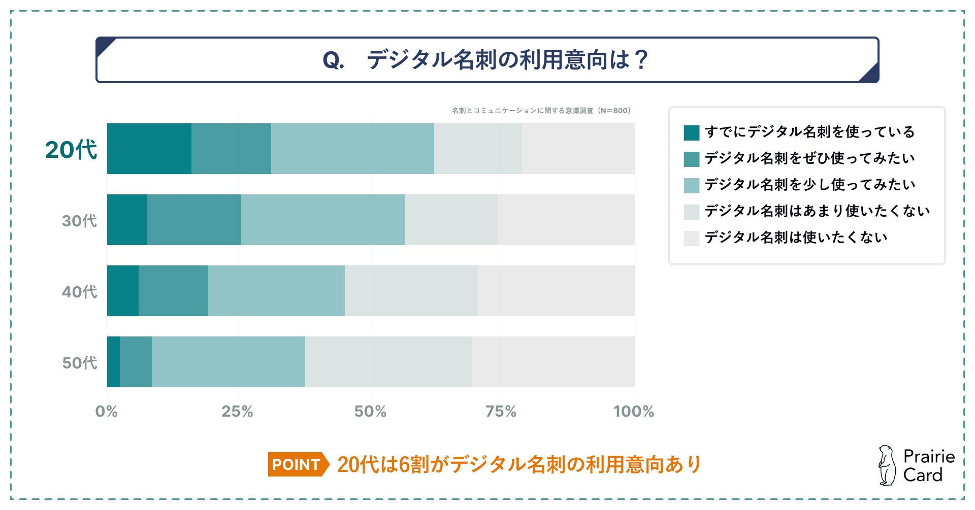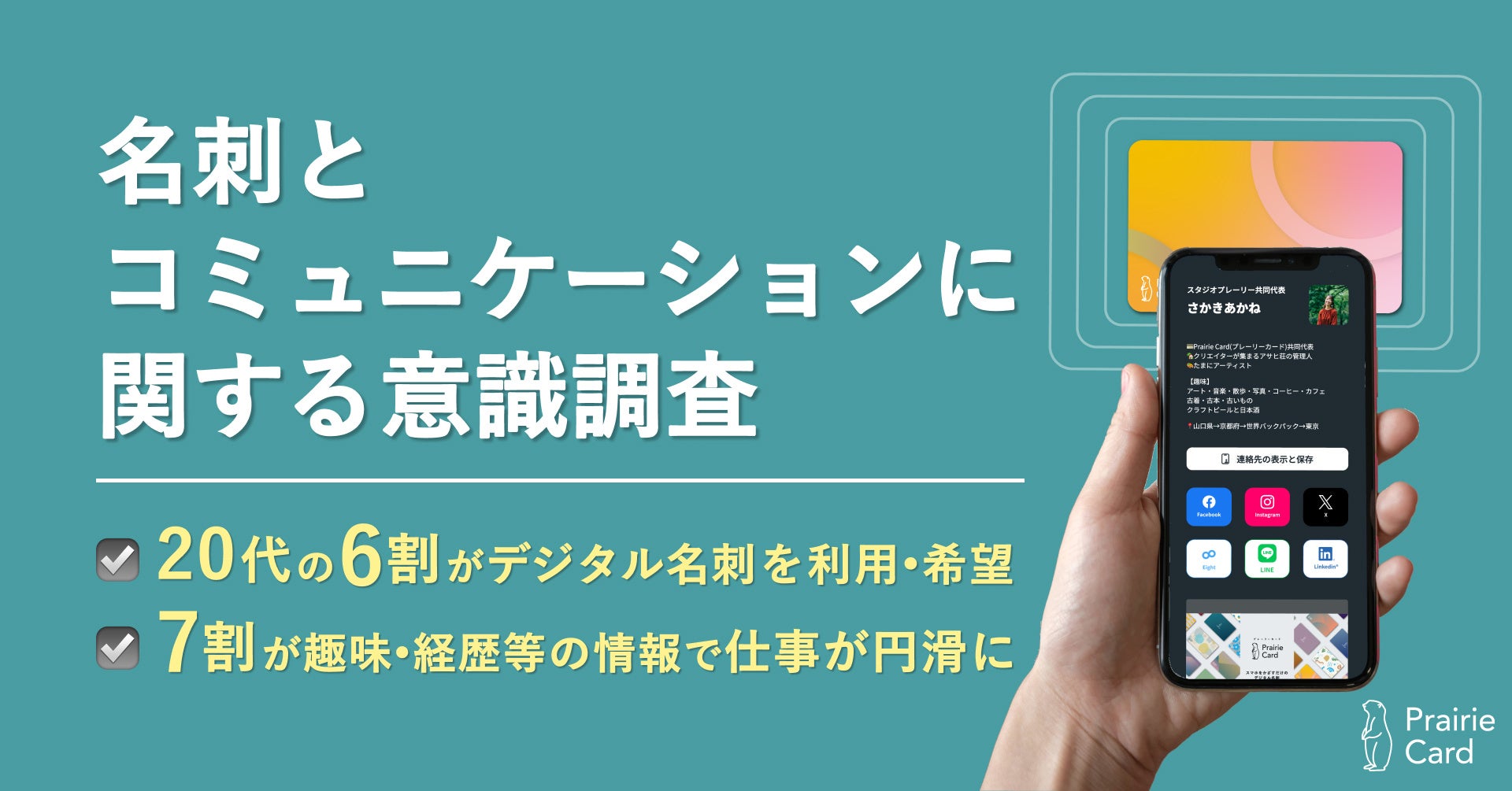 デジタル名刺「プレーリーカード」を提供する株式会社スタジオプレーリー(本社:東京都渋谷区、共同代表:片山大地・坂木茜音)は、年代別800人の会社員を対象に「名刺とコミュニケーションに関する意識調査」を実施いたしました。