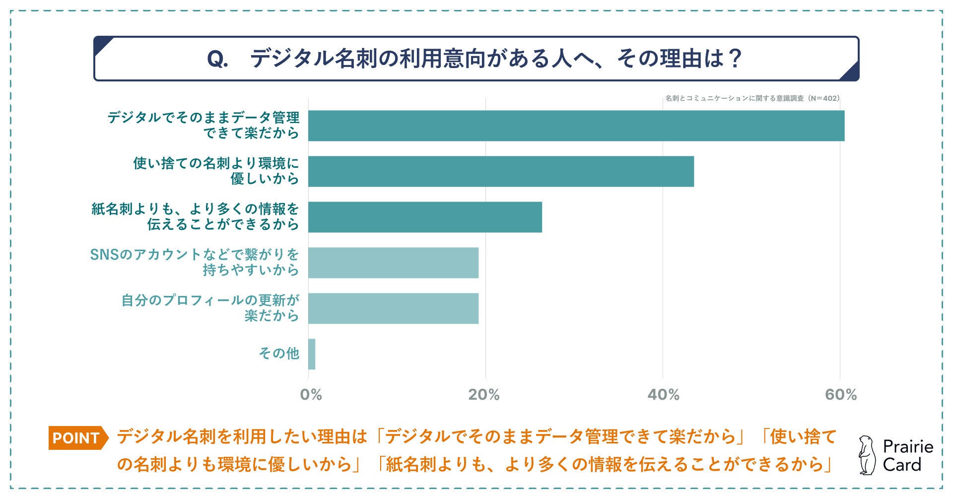 利用したい理由は「デジタルでそのままデータ管理できて楽だから」「使い捨ての名刺よりも環境に優しいから」「紙名刺よりも、より多くの情報を伝えることができるから」
