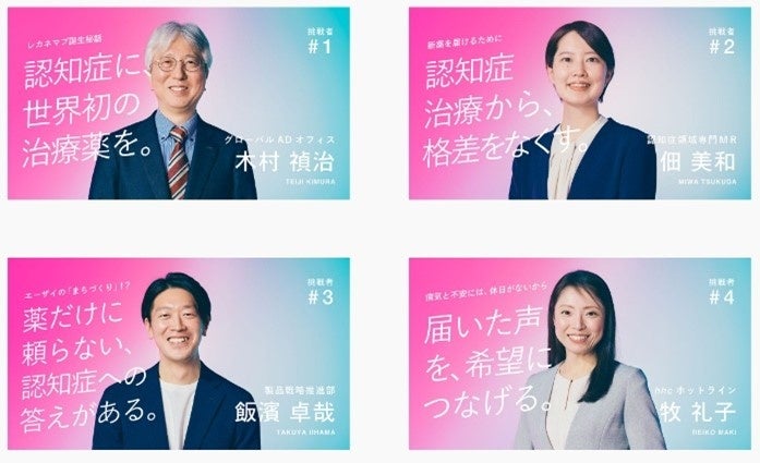 特に、当社がパイオニアとして長年注力している認知症領域においては、治療薬の創製にとどまらず、他産業・自治体などあらゆるパートナーの皆様とともに、予防からケアまで、認知症当事者様・ご家族・生活者の皆様を包括的にサポートする「認知症エコシステム」を構築することを通じて、誰もが自分らしく「生ききる」ことができる「認知症共生社会」の実現に取り組んでいます。このたび、認知症への「新しい答え」を追求し続ける当社の想いと活動を、より多くの一般生活者の皆様にご理解いただくために、特設サイトを公開しました。特設サイトでは、キャンペーン第一弾として、「認知症エコシステム」を構成するソリューションと、「新しい答え」に挑み続ける社員のインタビューを掲載しています。動画コンテンツを含め、今後、さらに掲載を充実していく予定です。