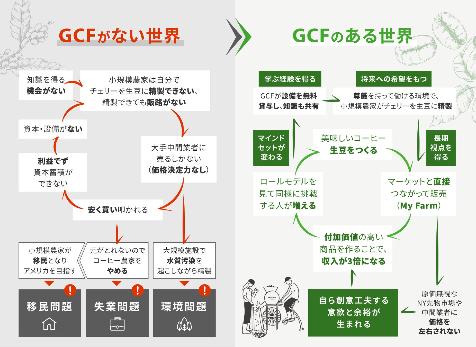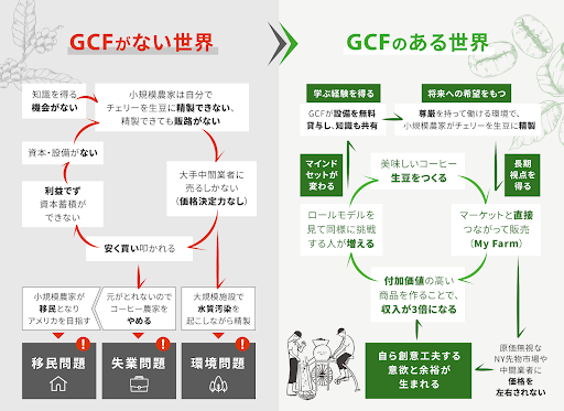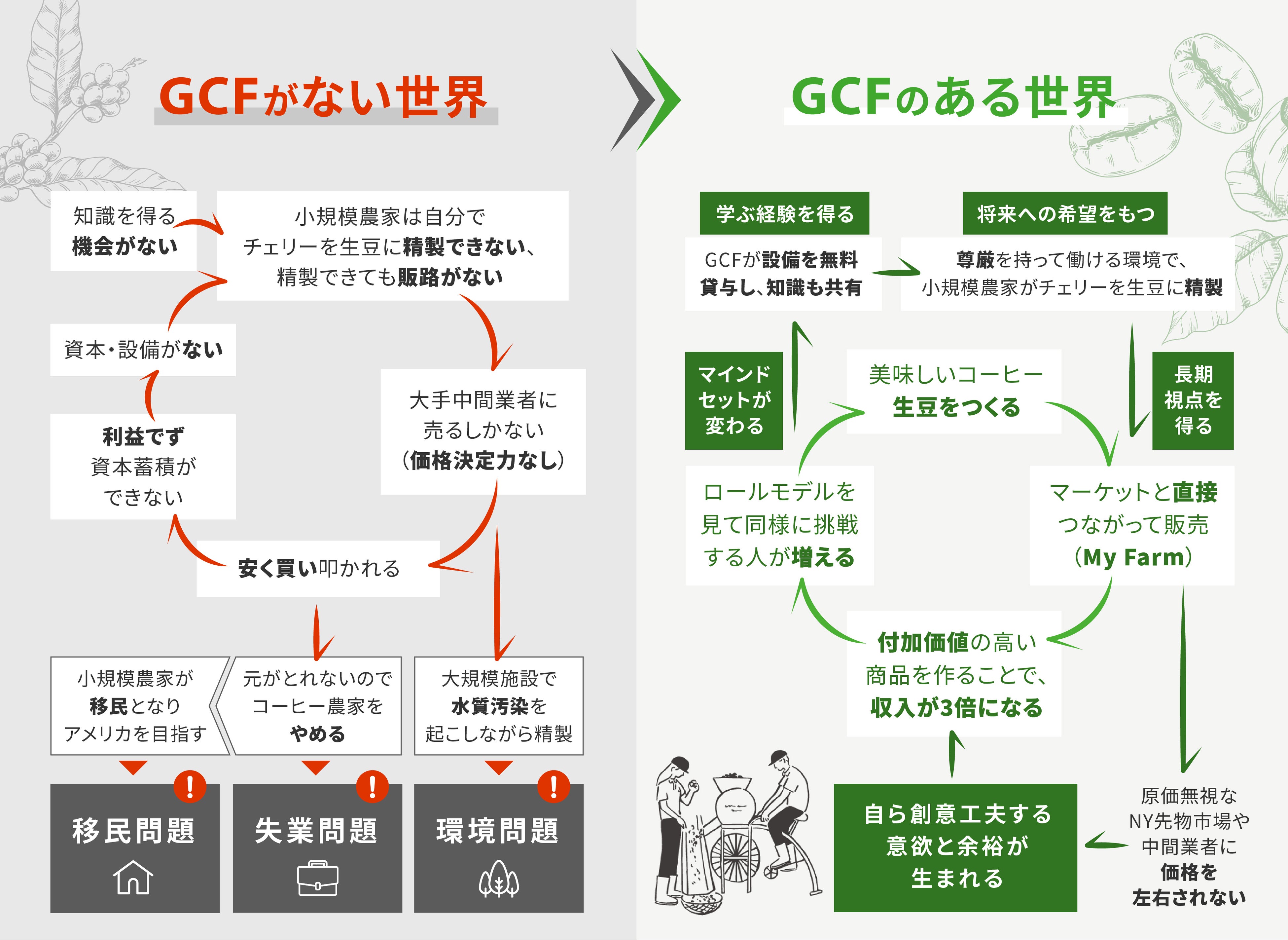 KIBOWは、世界有数のコーヒー生豆輸入国である日本の社会投資ファンドとして、GCFの取り組みが以下のようなポジティブなインパクトをもたらすことを期待して、GCFへの投資を決定しました。