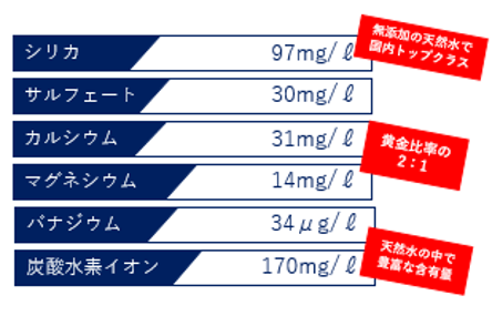 「のむシリカ」はシリカの含有量のみでなく、炭酸水素イオンやサルフェートなど現代人が不足しがちなミネラルも多く含んでいます。一般的にミネラルが多く含まれるほど硬度が高くなり飲みにくさを感じますが、「のむシリカ」は中硬水なので飲みやすく、毎日美味しく飲んでいただけます。
