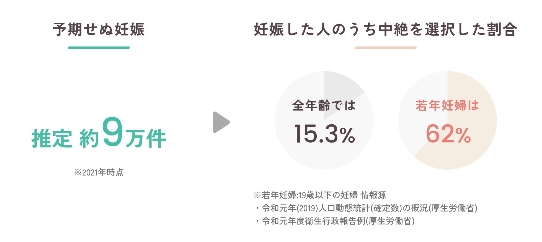 日本では、24歳以下の若者の予期せぬ妊娠が年間約9万件、人工妊娠中絶がはそのうちの62%の約5.4万件に上ります。もちろん、すべての若者の予期せぬ妊娠が「悲しい出来事」なわけではありません。しかし、予期せぬ妊娠をして困る若者がいることもまた事実であり、私たちはそのような若者に寄り添う場所を増やしたいと考えています。