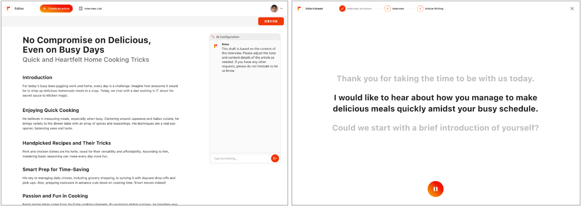 インタビュー音源を元にAIがライターに代わり記事を執筆する『Rimo AI Editor』と、質問自体もAIが構成してインタビューを実行する『Rimo AI Interviewer』の2つの機能で構成されます。ChatGPTを活用しており、AIと相談しながら記事の修正も可能です。