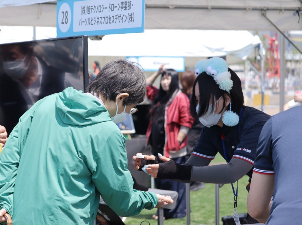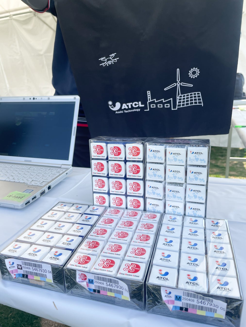 旭テクノロジーのブース内では実際にドローンの飛行デモで運ばれた物資を来場者に配布。来場者自身が「受け取る体験」を通じて災害時のドローン活用の有効性をリアルに体感する貴重な機会となりました。