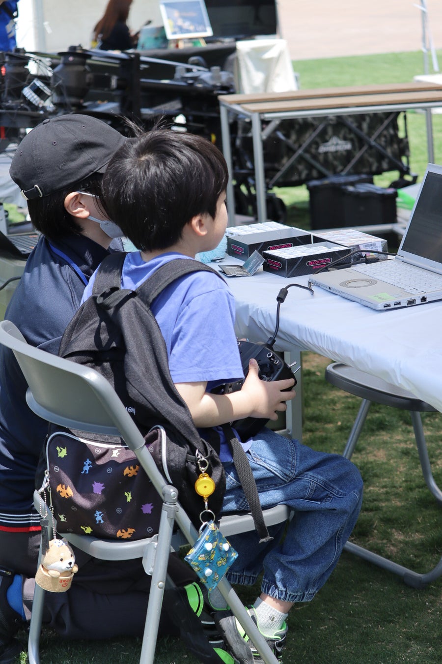 来場者がフライトシミュレーターを使ってドローンの操縦に挑戦。「飛行しているパイロットの姿がかっこいい!」「楽しい!」といった声が飛び交い、子供たちも夢中に。