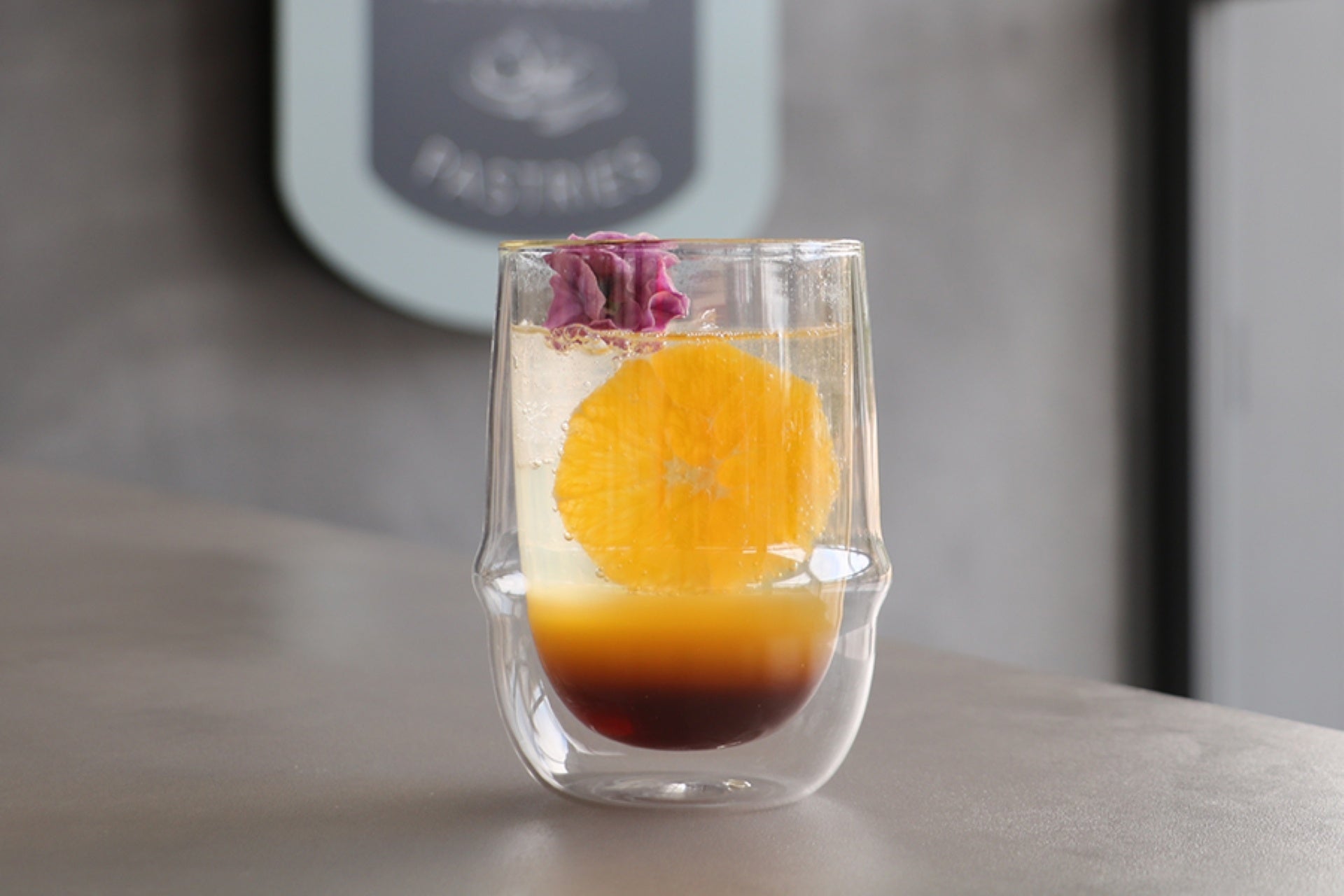 ビオラの香るシロップをいれたソーダとレモンピール入りのシロップでつくるドリンク