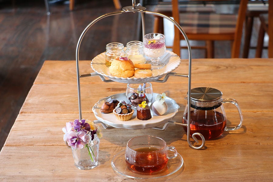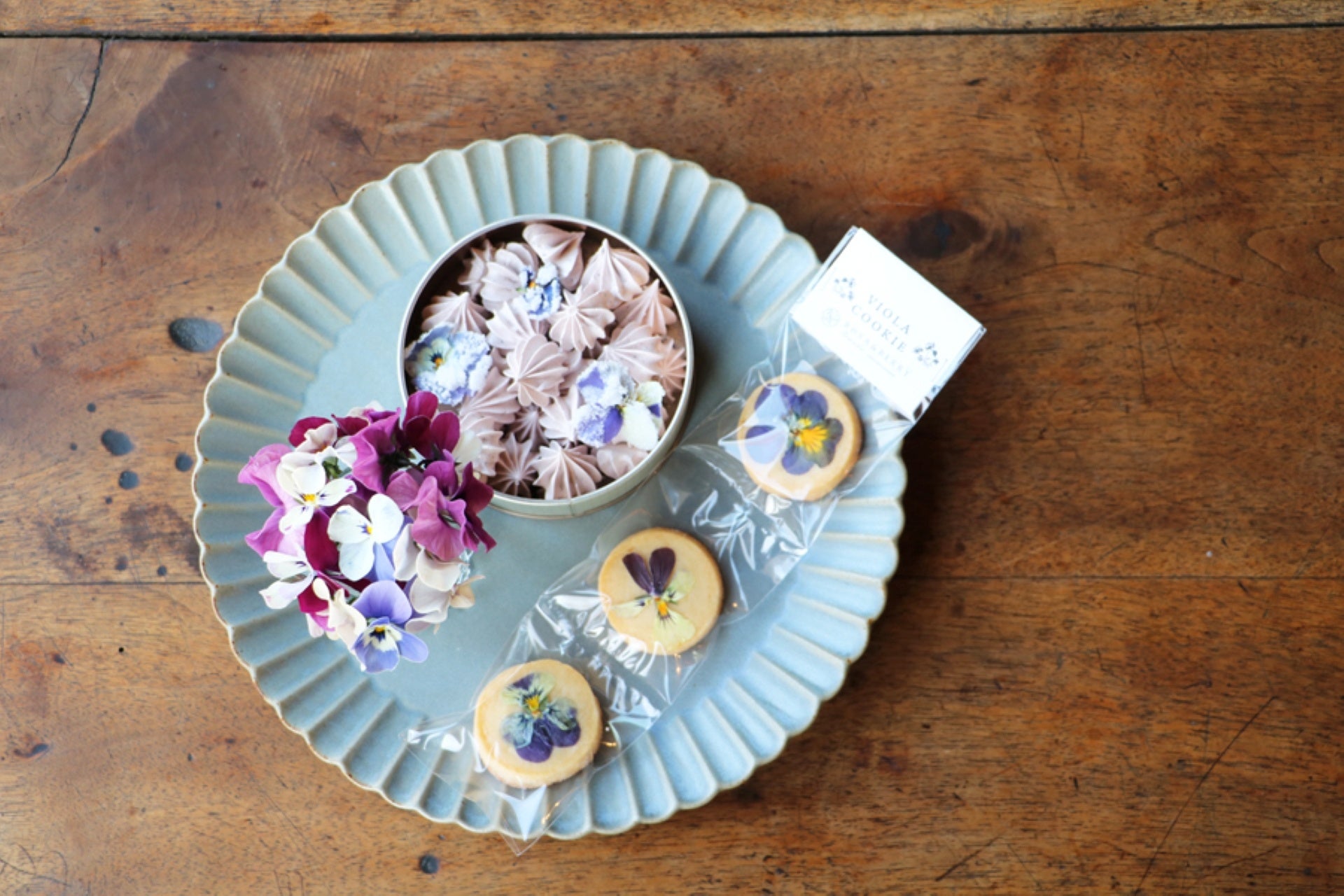 当園で栽培されたビオラで彩る焼き菓子たち。