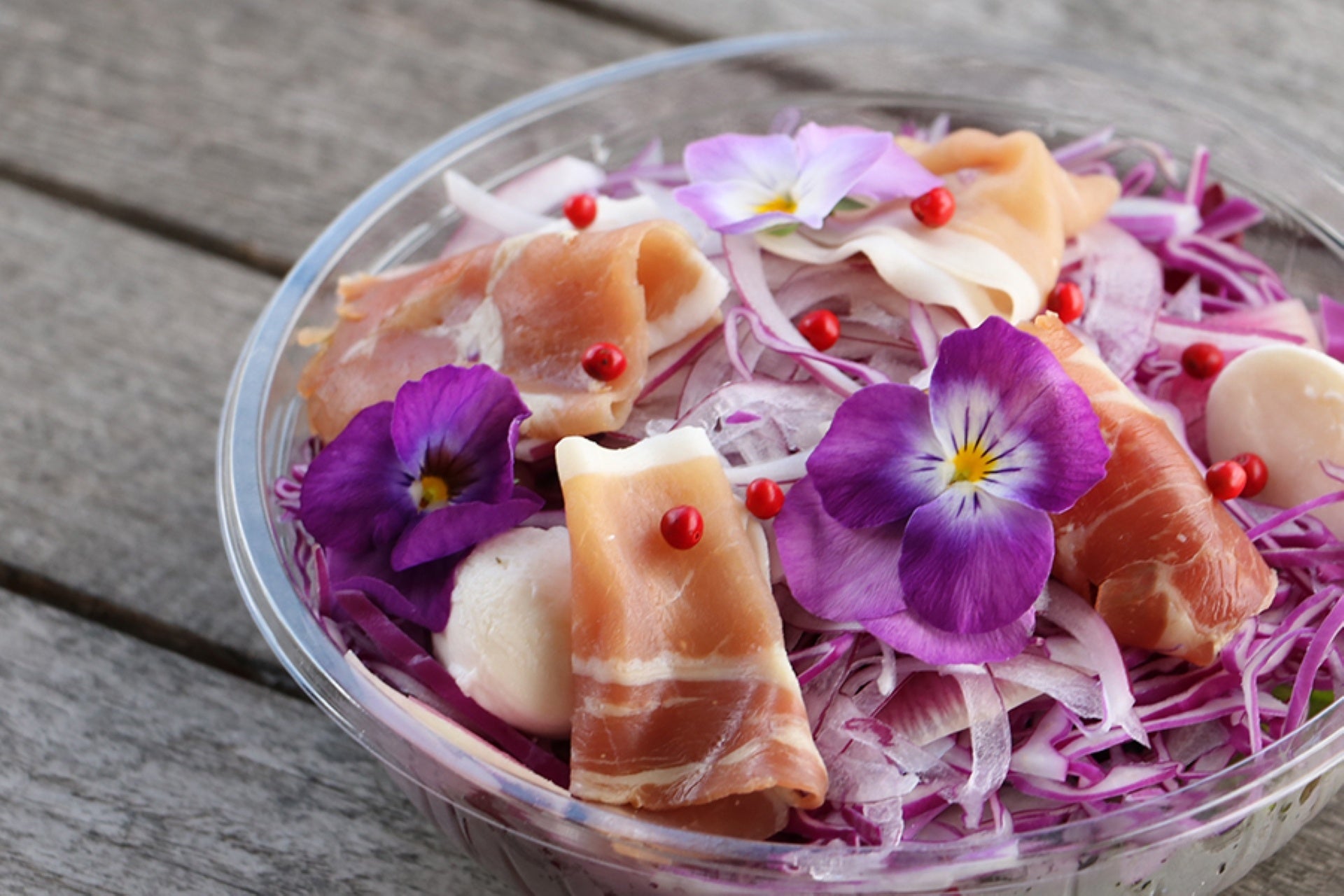 ビオラをイメージした見た目も美しいサラダを、ビオラシロップを使用したドレッシングでお召し上がりいただけます。