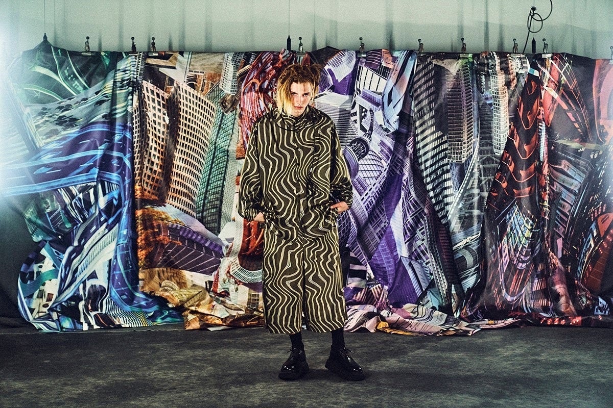 総柄のセットアップでは枯山水をモチーフにデザイン。スウェットは今季のUNITED TOKYOのテーマである「雪月風花」モチーフにカラーパッチのボックスロゴ風プリントに落とし込みました。コラボレーションLOOKもMargt(PERIMETRON)高畠新によるディレクションで撮影。東京の風景をコラージュした布を有機的な山に見立て、テーマである「混東京」を表現したLOOKに仕上がりました。