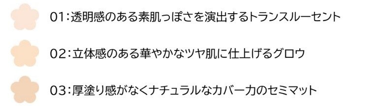 白浮き感や粉っぽさがなく、肌にとけこむようになじみます。なりたい肌の質感でチョイスできる3種で、自由自在に仕上がりの印象をコントロールします。